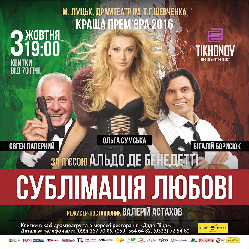 Іскрометна комедія «Сублімація любові» з незрівнянною Ольгою Сумською, народним артистом України Євгеном Паперним і заслуженим артистом України Віталієм Борисюком у головних ролях відбудеться у Луцьку.