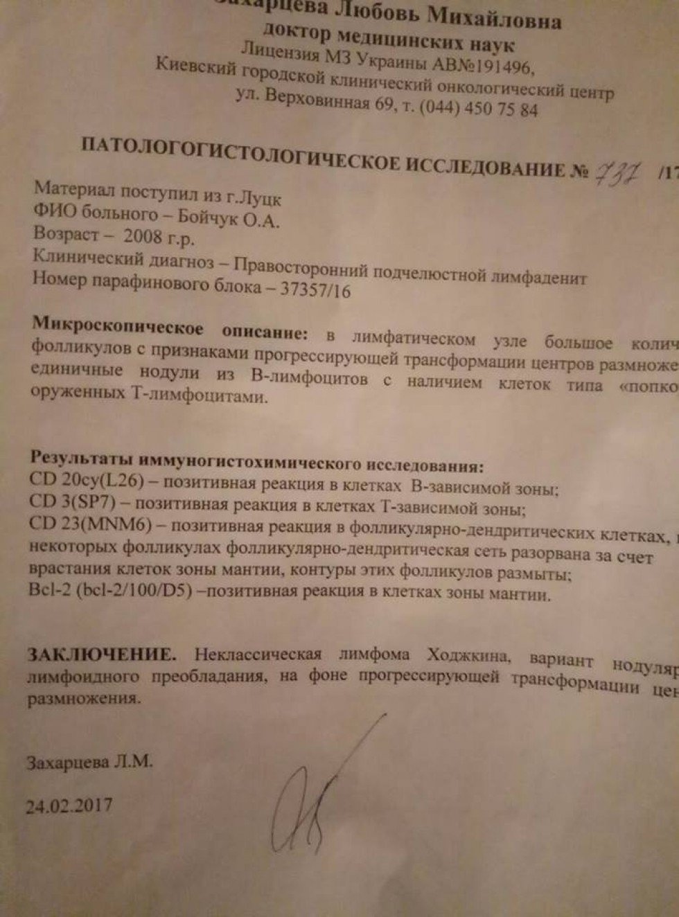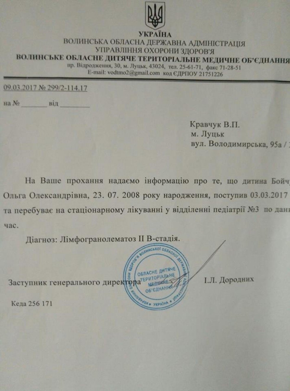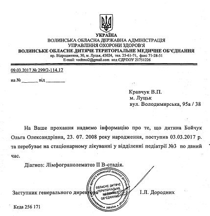 Дитиня поставили страшний діагноз - лімфогранолематоз ІІ В-стадія (злоякісне захворювання лімфоїдної тканини). Дитина з 3 березня цього року перебуває на стаціонарному лікуванні у дитячій лікарні.