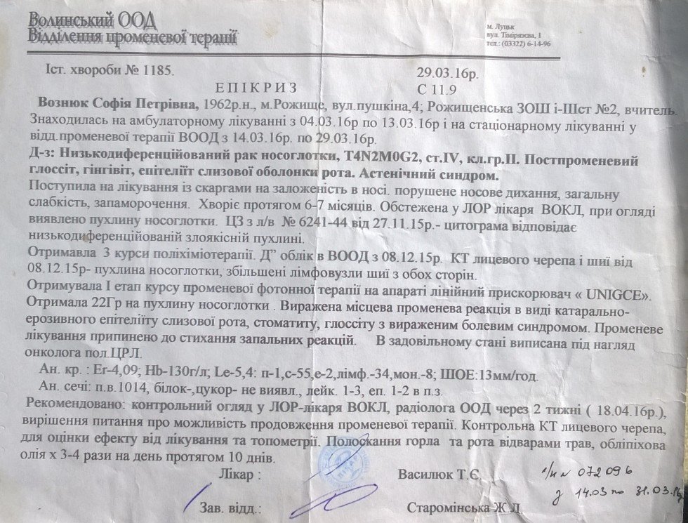 Не так давно доньці бібліотекара ЗОШ №2 міста Рожище Галини Кривицької, Софії Вознюк, до речі, теж педагога цього ж освітнього закладу, поставили страшний діагноз – низькодиференційований рак носоглотки, T4N2M0G2, ст. IV, кл. гр. ІІ. Постпроменевий глоссіт, гінгівіт, епітеліїт слизової оболонки рота. Астенічний синдром. Вона вже отримала 3 курси поліхіміотерапії та 1 курс променевої фотонної терапії, - інформує «Район.Рожище».