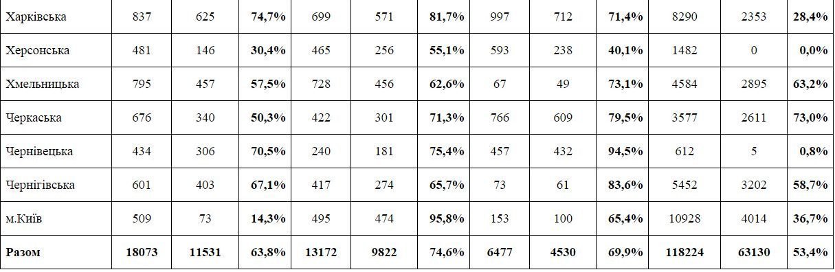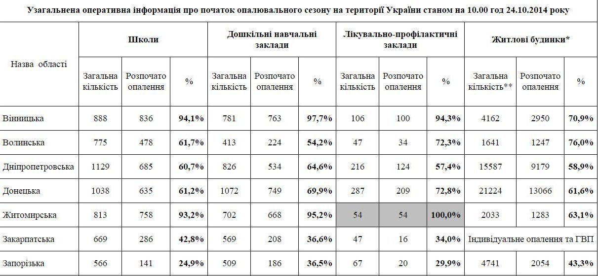 Загалом в Україні вже опалюється 63,8% шкіл, 74,6% дошкільних навчальних закладів, 69,9% лікувально-профілактичних закладів та 53,4% житлового фонду.