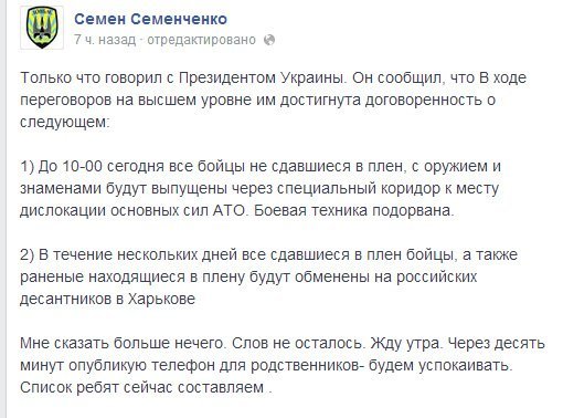 1) До 10.00 сьогодні всі бійці, які не здалися у полон, зі зброєю і прапорами будуть випущені через спеціальний коридор до місця дислокації основних сил АТО. Бойова техніка підірвана.