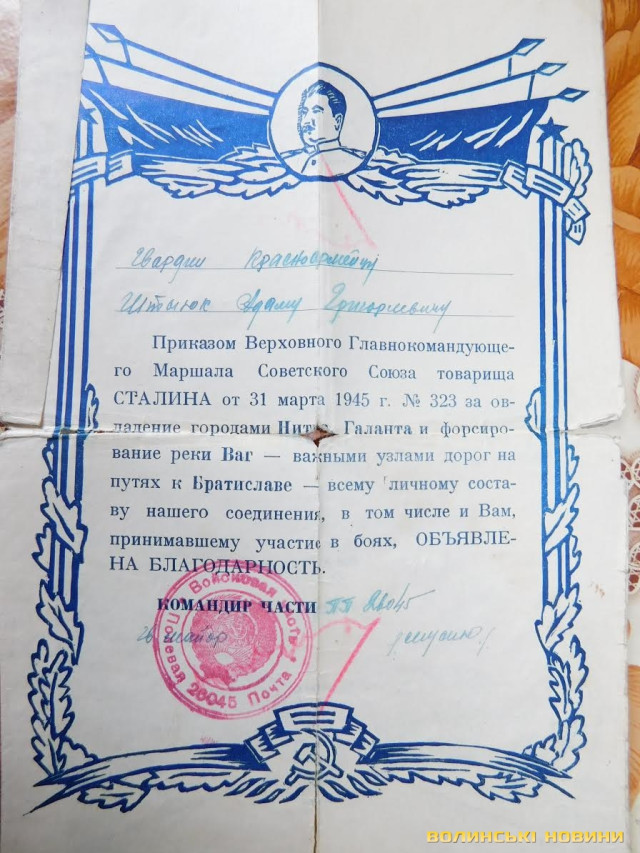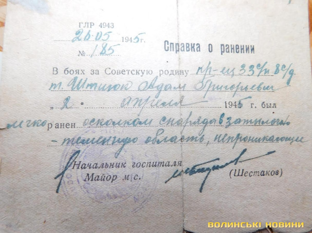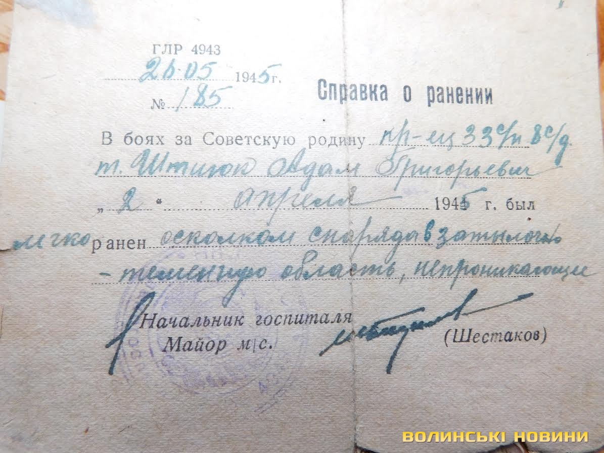 Надія Адамівна розгортає військовий квиток і показує зроблені в ньому записи, в яких значиться, що з червня 1944-го по квітень 1945-го рядовий-мінометник Адам Штиюк брав участь у військових діях. А у графі знизу ще один запис: «2 квітня 1945 року тяжко поранений у потиличну частину голови». Лікувати поранення Адаму Григоровичу, за словами дружини, довелось у військовому госпіталі аж до Дня Перемоги.