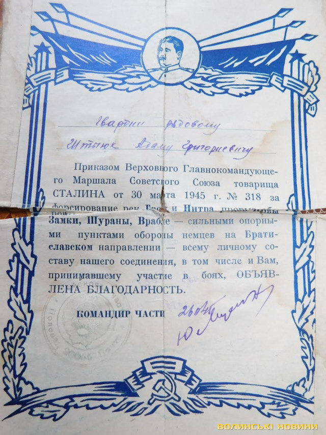 Про мужність рядового Штиюка свідчать подяки від Верховного Головнокомандувача. Одна датована 30 березня 1945 року за звільнення міст Шурани, Враблє, які були важливими опорними пунктами німецької оборони на Братиславському напрямку. Друга – за форсування річки Ваг та заволодіння важливими вузловими шляхами на підступах до Братислави. Саме у цих запеклих боях проти гітлерівських загарбників і отримав молодий юнак поранення, яке давалося взнаки усе подальше життя.