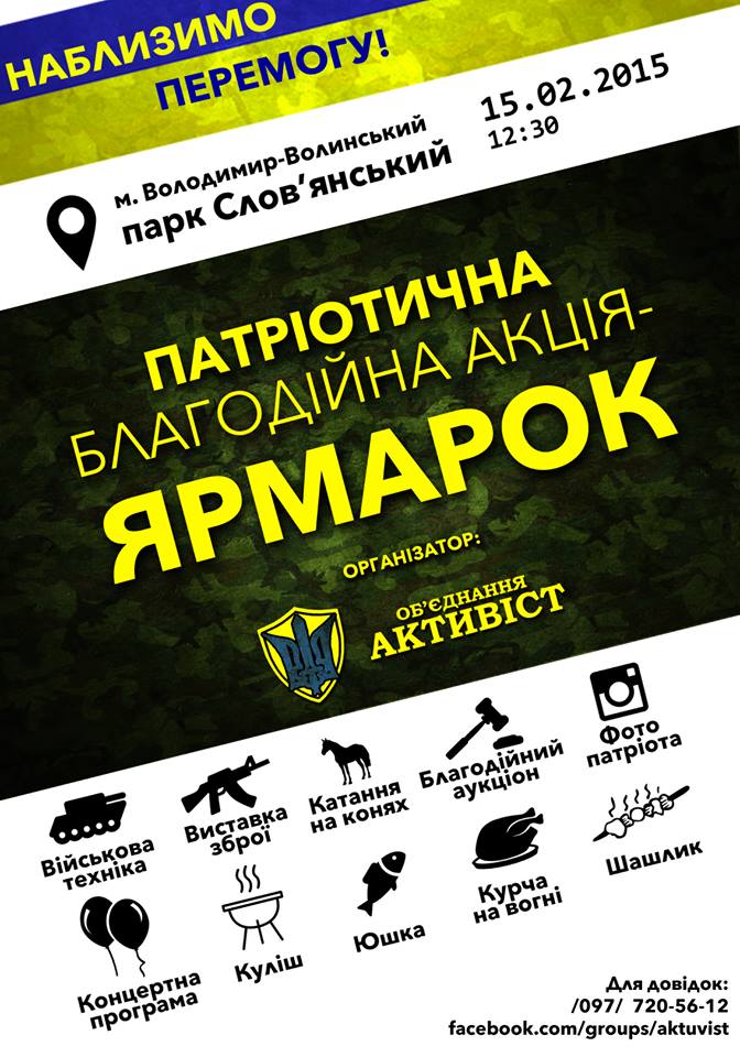 Патріотична благодійна акція-ярмарок відбудеться 15 лютого у Володимирі-Волинському. Початок - о 12:30. Місце проведення - парк Слов'янський. Про це інформує в мережі волонтер Костянтин Зінкевич.