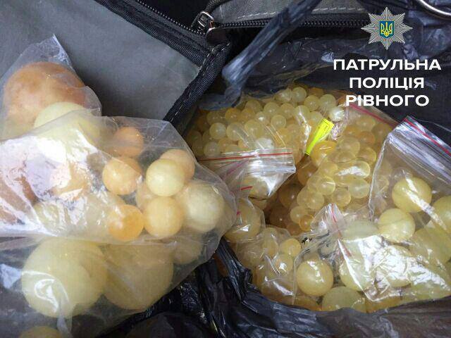 Під час огляду авто патрульні вияивли у багажнику бурштин великих фракцій загальною вагою 2 кілограми 300 грамів, а також уже оброблене та відшліфоване каміння у вигляді куль різного діаметру вагою 4 кілограми 600 грамів.