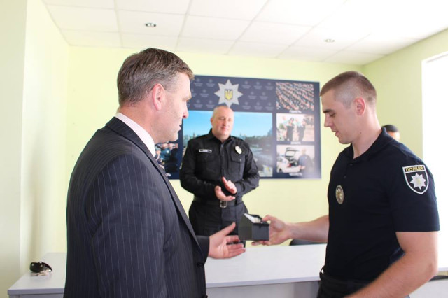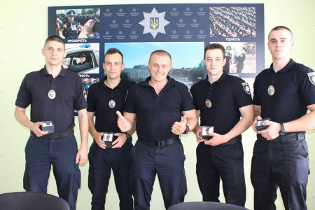 Начальник ГУНП, генерал поліції третього рангу Петро Шпига та його заступники Володимир Солоненко і Сергій Козак привітали патрульних поліцейських Сергія Лігу, Сергія Цигульова, Ігоря Воронова та Віктора Бубала, відзначили, що вони відмінно виконують службові обов’язки та вручили їм цінні подарунки – годинники.