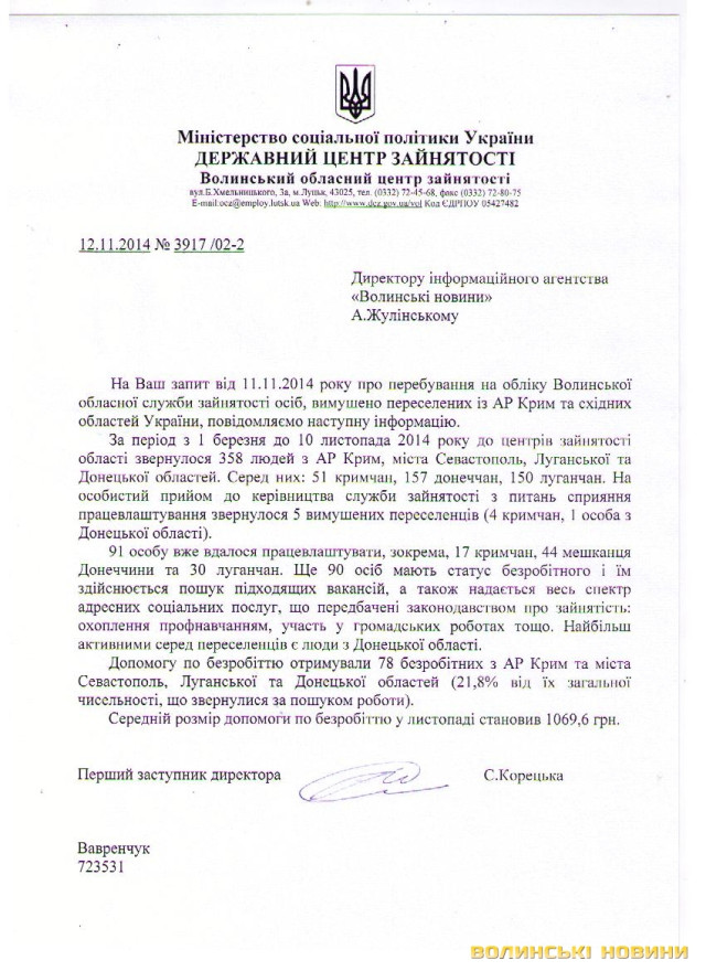Як інформують у обласному центрі зайнятості, за період з 1 березня по 10 листопада 2014 року, до центрів зайнятості звернулося 358 людей з АР Крим, міста Севастополь, Луганської та Донецької областей. Серед них: 51 кримчанин, 157 донеччан, 150 луганчан. Працевлаштувати вдалося 91 особу, ще 90 осіб мають статус безробітного і їм шукають роботу. Найактивніше, з-поміж переселенців, роботу шукають переселенці з Донецької області.