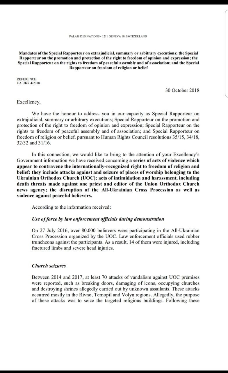 «Отримана нами інформація про серію актів насильства, які суперечать міжнародному праву на свободу релігії і віри, включають напад на церкви належать УПЦ, акти залякування і переслідування, в тому числі загроза вбивства одного священика і редактора Союзу православної церкви. Ці атаки зустрічаються в основному в Рівненській, Тернопільській та Волинській областях», – йдеться в тексті комунікаційного запиту ООН.