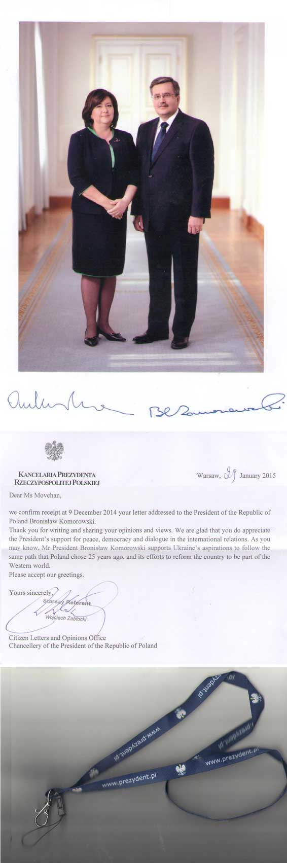 У канцелярії Польського Президента подякували Марійці, Борису та Павлу за те, що активно поширюють свої думки та погляди, а також за те, що високо оцінують діяльність керівника сусідньої держави щодо встановлення миру, демократії та діалогу у міжнародних відносинах.