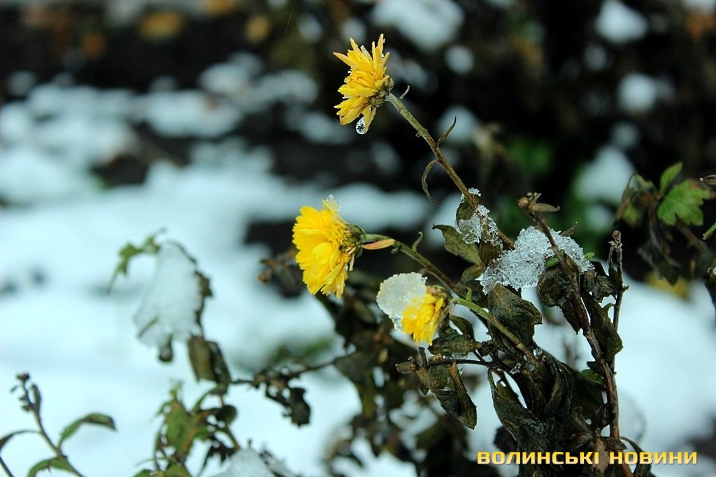 Перший грудневий день у Луцьку – багатогранний. Він поєднує у собі і білосніжну паморозь на деревах, і зелене листя, і квіти-«льодяники».