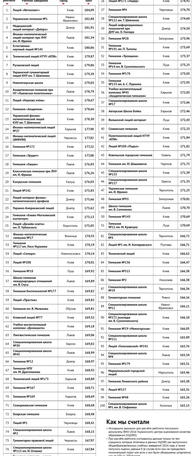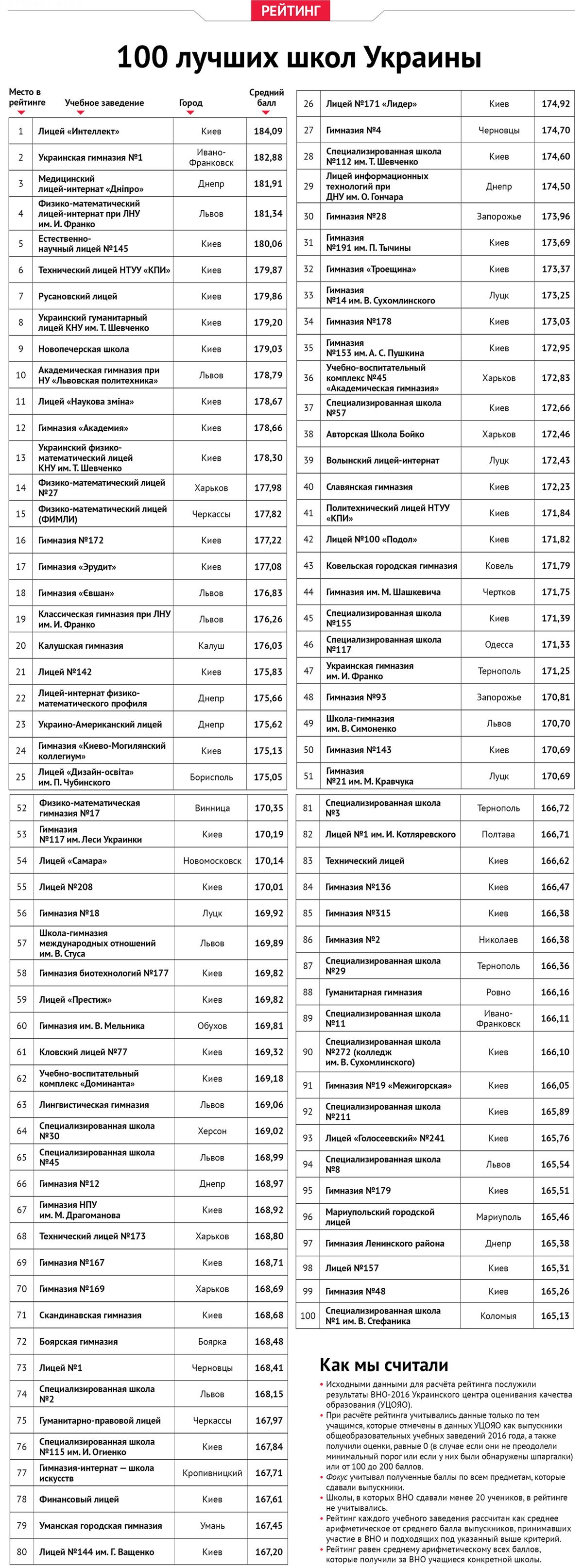 Цей перелік шкіл уклали, аби допомогти українцям зрозуміти, де в нашій країні готують найбільш конкурентоздатних і освічених випускників. За вихідні дані були взяті результати ЗНО (зовнішнього незалежного оцінювання) за 2016 рік.