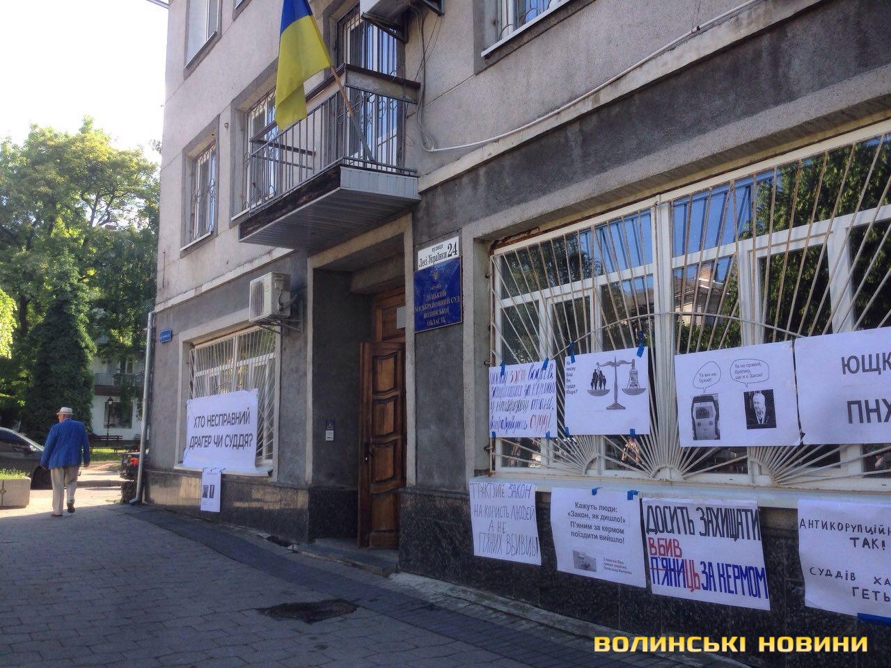 Поблизу Луцького міськрайонного суду зібрались активісти, які вимагають відставки судді, котрий вів справу Голови громадської ради при облдержадміністрації Олександра Волянюка. Вони запевняють, що, буцімто, драгер працював справно і Волянюк був за кермом нетверезий.