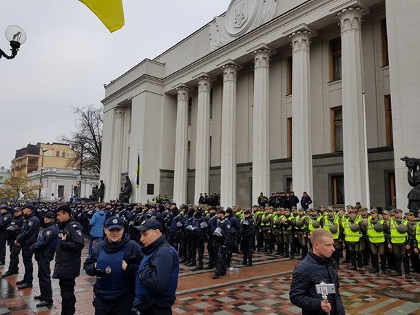 Біля самої будівлі парламенту розташований кордон з близько 300 правоохоронців, які стоять у шість шеренг, перші три з яких - співробітники Нацполіції - із шоломами, кийками і щитами.