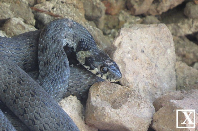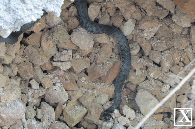 З огляду на відсутність характерних яскравих жовтих «вушок», це може бути не вуж. Хоча ми не беремося класифікувати гадину.