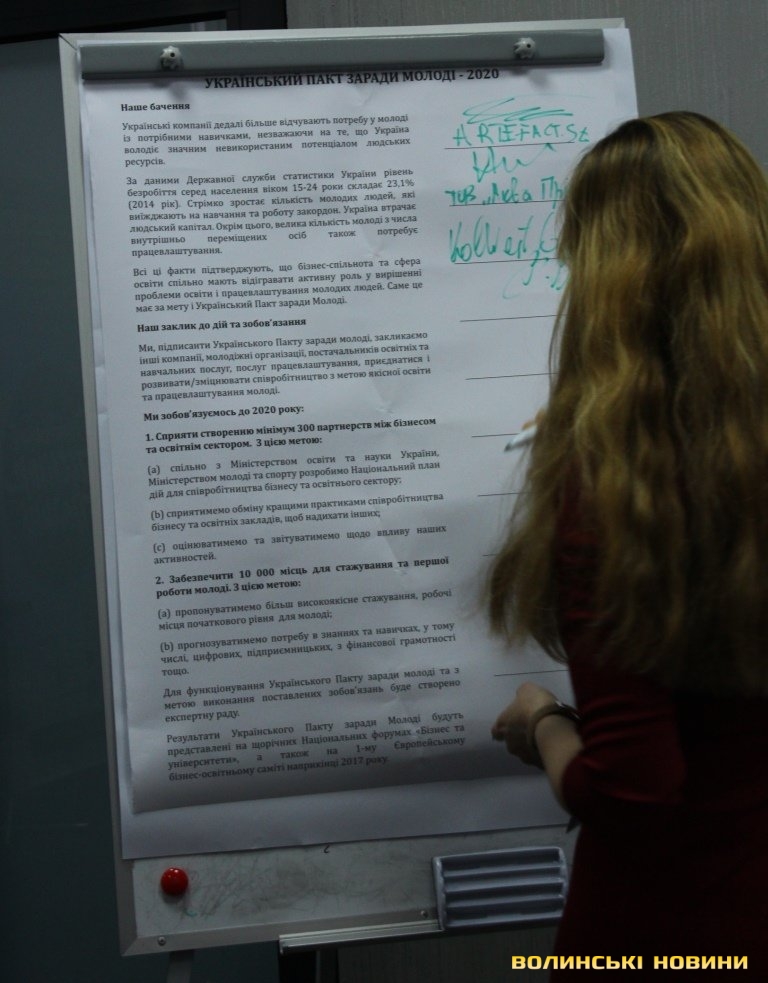 Луцькі та волинські підприємці, зокрема «Artefact.St», «Модерн-Експо», «Теремно Хліб», «AQUA PRINT» та інші, доєдналися до Українського пакту заради молоді – 2020, покликаного за три роки забезпечити близько 10 тисяч місць для стажування та першої роботи, а також налагодити 300 партнерств між бізнесом і освітнім сектором.