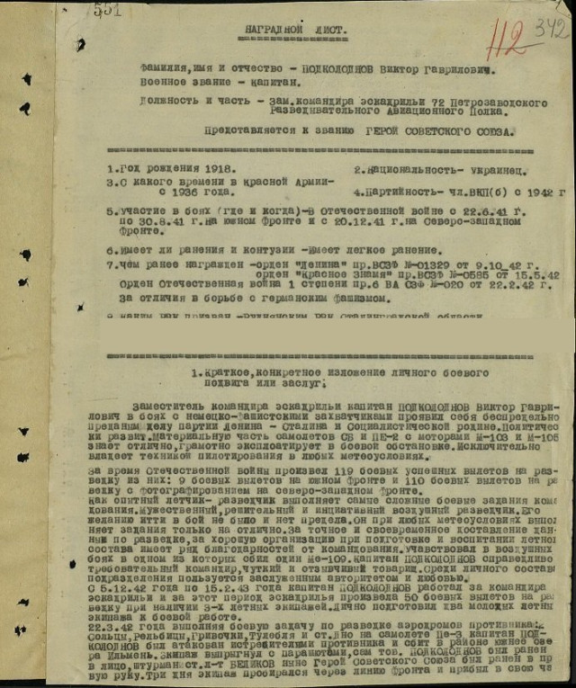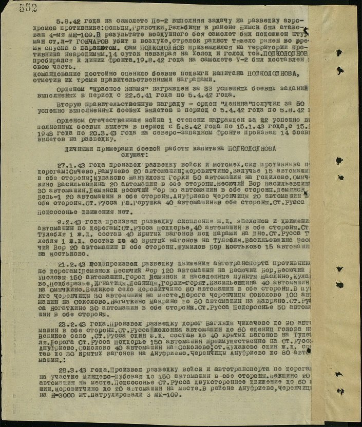 За станом на 5-те серпня 1942 року командир ланки 6-ої окремої розвідувальної авіаескадрильї дальньої дії старший лейтенант Подколоднов здійснив 57 бойових вильотів на розвідку ворожих позицій. Особливо успішними були його вильоти на розвідку бойових позицій блокованого Дем’янського угрупування Вермахту. За ці героїчні подвиги невловимого розвідника вперше представили до звання Героя Радянського Союзу.