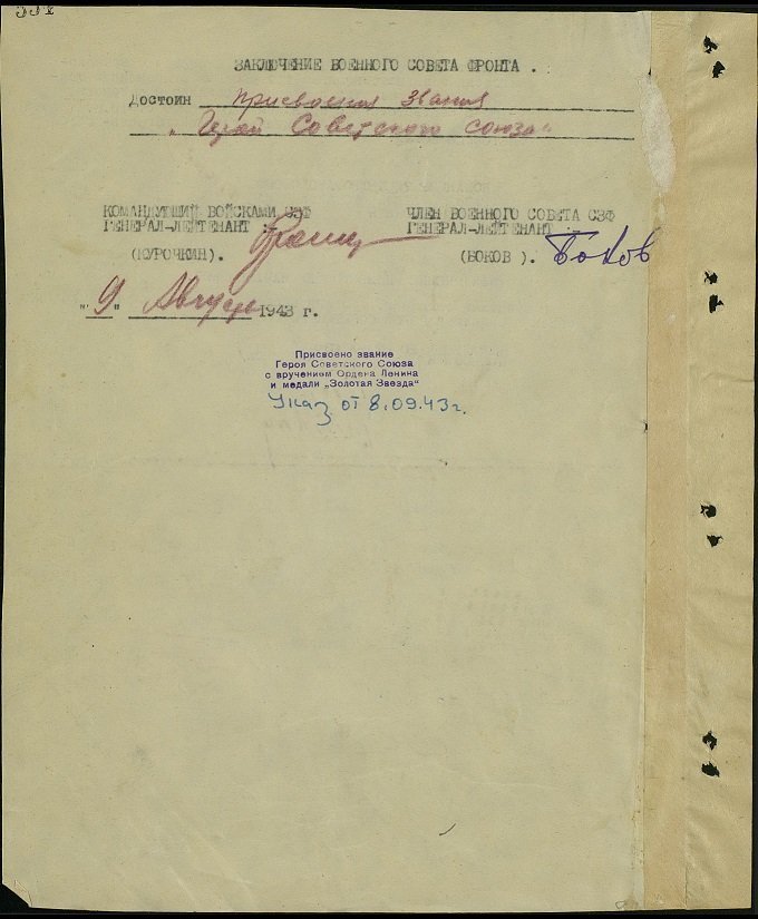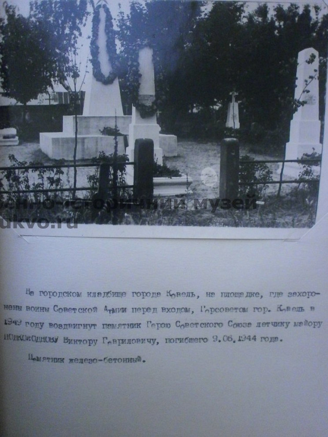 «9 липня 1944 року при виконанні бойового завдання з розвідки об’єктів за маршрутом Ковель-Володимир-Волинський у районі Турійська літак, що пілотувався командиром ескадрильї 72-го Петрозаводського окремого розвідувального авіаполку Героєм Радянського Союзу Подколодновим Віктором Гавриловичем, був атакований десятком німецьких винищувачів. Екіпаж розвідувальної машини, до складу якого входили також штурман ескадрильї, Герой Радянського Союзу Смірнов Володимир Антонович і начальник зв’язку ескадрильї старший лейтенант Гундарєв Павло Ілліч, вступив у бій, в ході якого було підбито три ворожих винищувача, але крилата машина Героїв також була підбита. Палаючий літак-розвідник екіпаж вивів за лінію фронту, намагався здійснити посадку, але машина при ударі об землю взірвалась, льотчики загинули».