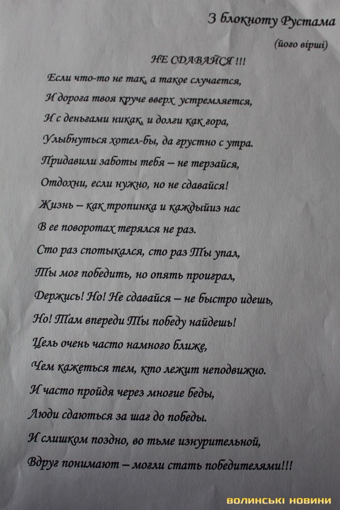 Той невеликий блокнот, як справжній друг, слухав найсокровенніші думки Рустама. І досі його рідні не можуть спокійно читати рядки, написані рукою близької людини.«Немає на світі більшого щастя, ніж віддати своє життя за свій народ, за свою Батьківщину!»…