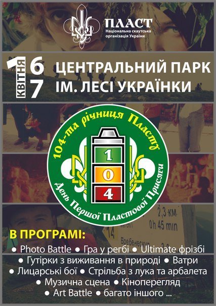 12 квітня 1912 року склали першу пластову присягу. З цього визначного дня минуло 104 роки. Тому з нагоди 104-ї річниці Пласту 16-17 квітня в парку імені Лесі Українки відбудеться безліч цікавих та захоплюючих заходів.