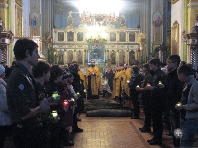 Активісти Волинського осередку Національної скаутської організації України «Пласт» передали Вифлеємський вогонь миру православній громаді Волині.