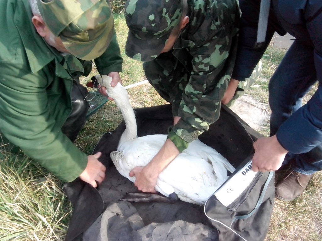 Для порятунку птаха на місце події виїхали працівники екоінспекції. На гумовому човні екологи швидко дістались середини болота, виловили знесиленого лебедя та доправили його на берег.
