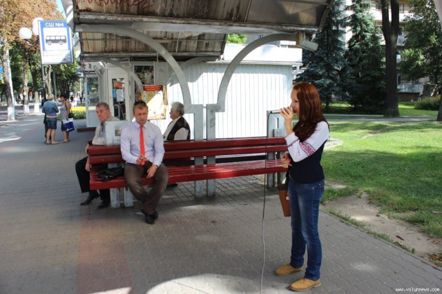 Після цього, поети вирушили до зупинки навпроти комплексу «Гранд Волинь». Дорогою організатор марафону Володимир Столярчук вітав лучан та гостей міста зі святом та закликав покращувати демографічну ситуацію в Україні. На зупинці громадського транспорту, окрім нього, поезію декламувала Олександра Ватащук.