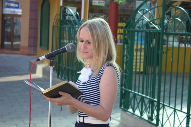 Продовжили марафон на Книжковому пасажі, що на вулиці Лесі Українки. Першою ліричну поезію зачитала Катерина Пташка.