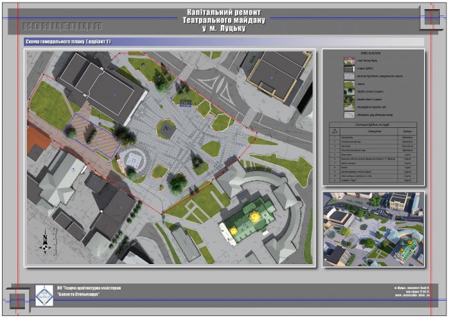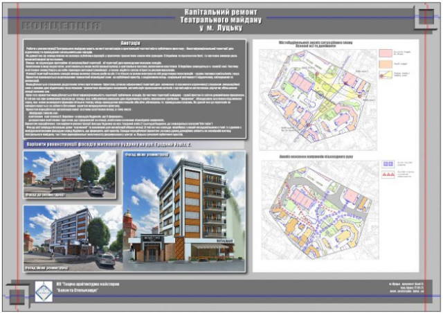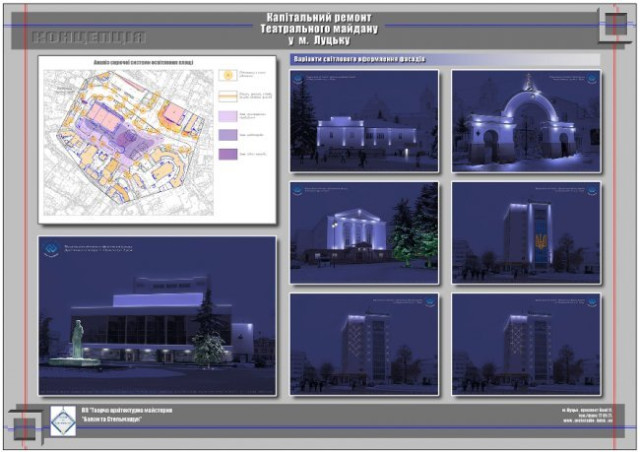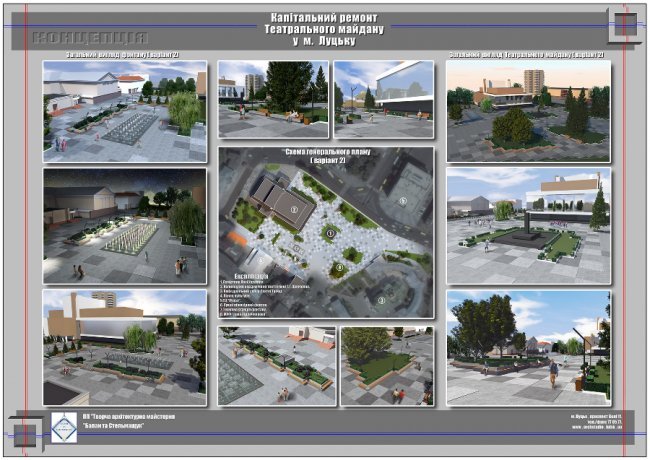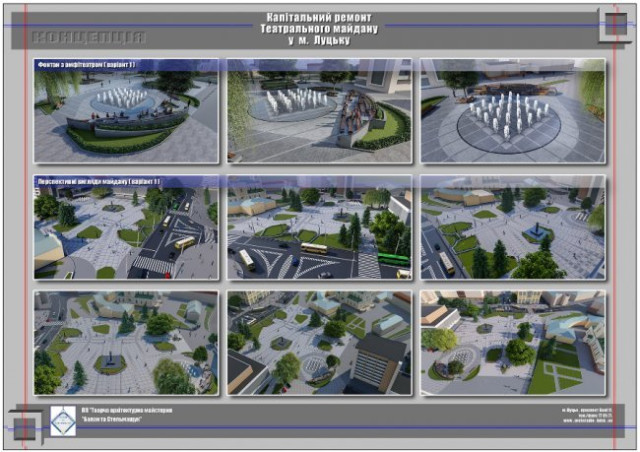 На даний час Театральний майдан фактично є транзитною зоною між вулицею Лесі Українки та проспектом Волі, та частково виконує роль неорганізованої автостоянки. Відтак, архітектори пропонують перетворити транзитну пішохідну зону на публічний простір, з виділенням місць соціальної активності і відпочинку, спілкування та релаксації.