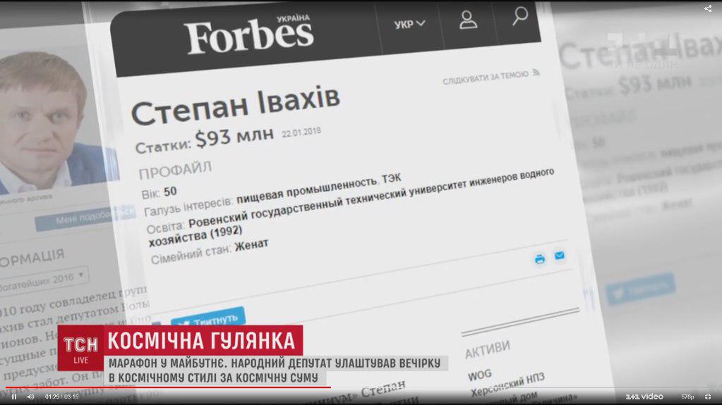 Зі слів охоронців, у залі справляють ювілей, подивитися простим смертним вони не дозволяють.Також на кадрах видно і самого ювіляра. Степан Івахів – власник компаній «Континіум», куди входять автозаправки «WOG». «Forbes» у 2015 році оцінив статки Івахіва майже в 100 мільйонів доларів.Серед запрошених гостей – рідні та політики, зокрема в об’єкти камери потрапляє Володимир Литвин, а також чоловік, схожий на депутата Сергія Мартиняка.