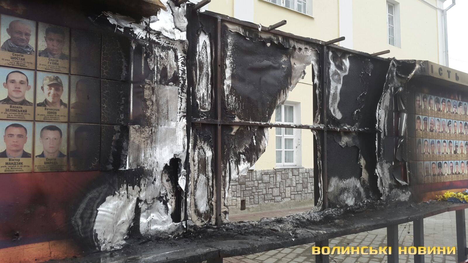 Учора, 24 листопада, близько 4 години ранку виникла пожежа на інформаційному стенді «Загинули за Незалежність України», який розташований на Театральному майдані в Луцьку. Вогнем знищено 3 метри стенду із фотографіями, частину фотографій закопчено димом.