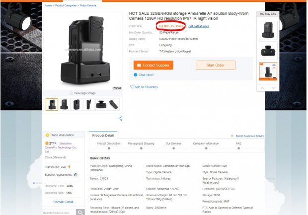 На сайті Alibaba китайський виробник продає нагрудні відеокамери за 80-95 доларів (в залежності від замовленої партії). Однак поліція купить такі камери в українського постачальника за вдвічі дорожчою ціною, інформує канал 24.