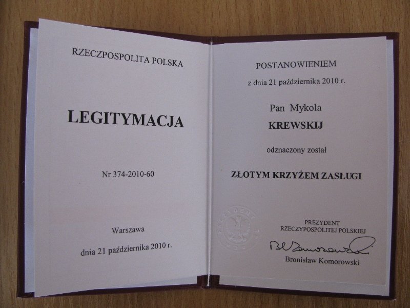 Постанову про нагородження Кревського президент Польщі підписав ще 21 жовтня 2010 року.