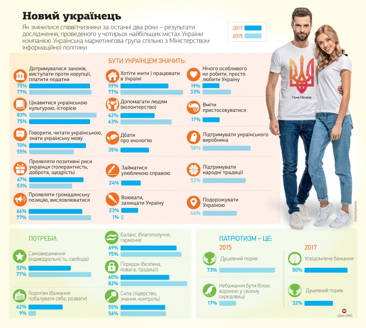 Про це свідчать результати дослідження To be Ukrainian, проведеного в 2017 році в чотирьох найбільших містах України (Києві, Одесі, Харкові та Львові) компанією «Українська маркетингова група» (UMG) спільно з Міністерством інформаційної політики, пише журнал Новое Время.