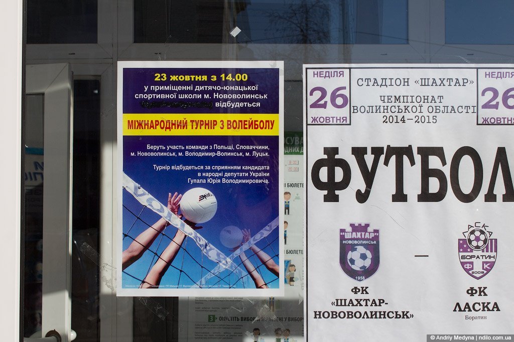 В окрузі № 19 на вході до дільниці № 0771110 у місті Нововолинськ висів плакат з запрошенням на турнір за підтримки кандидата Юрія Гупала. Після зауваження від спостерігача ОПОРИ голова комісії зняв оголошення.