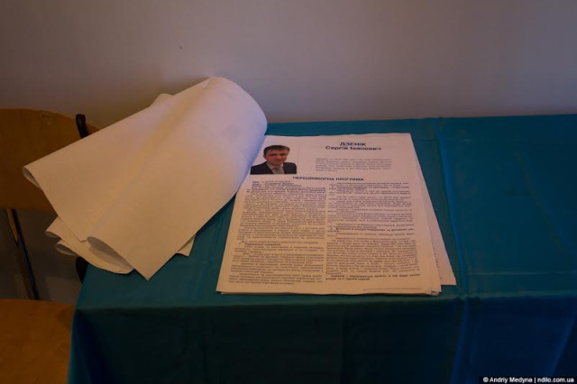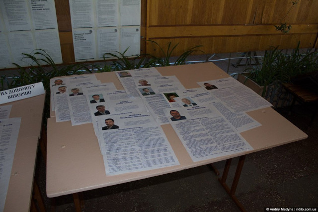 У дільниці № 071106 (м.Нововолинськ, школа №7, вестибюль вул. Кауркова, 43) інформаційні плакати мажоритарників просто розкидані на столі.