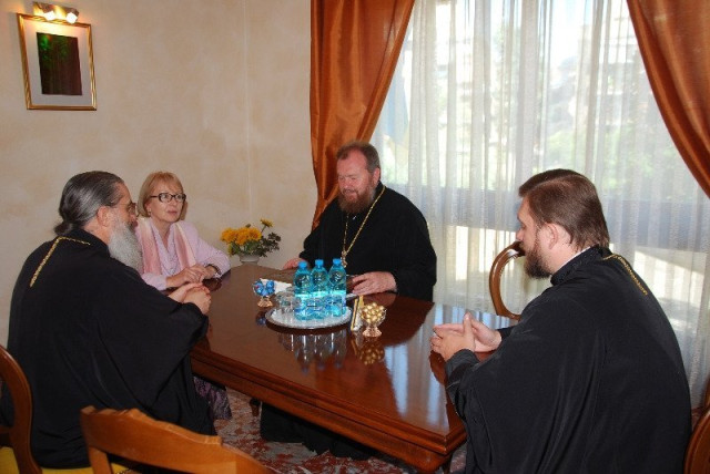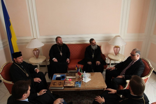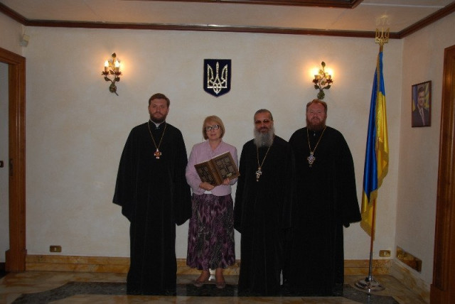 У рамках презентації факсимільних видань УПЦ в Європі у Посольстві України в Італії (Рим) відбулась зустріч делегації УПЦ із Надзвичайним і Повноважним Послом України в Італії Євгеном Перелигіним. На зустрічі були присутні секретар Предстоятеля УПЦ архієпископ Переяслав-Хмельницький і Вишневський Олександр, секретар Волинської єпархії протоієрей Миколай Бондарук, голова інформаційно-просвітницького відділу Волинської єпархії протоієрей Валентин Марчук, настоятель Свято-Амвросіївської спільноти міста Мілану архімандрит Амвросій (Макар), аташе з питань культури Посольства України в Італії Наталія Тернова.