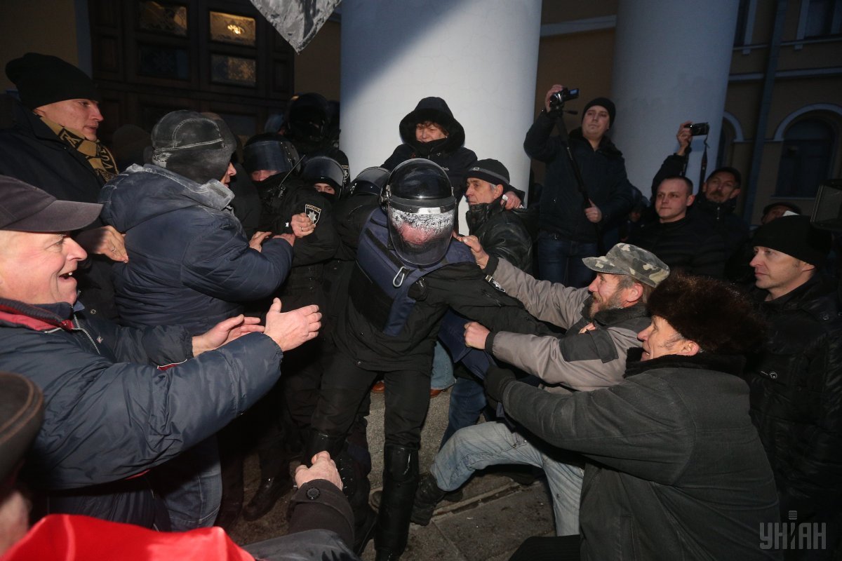 "Учасники акції застосували піротехніку, кидали петарди, намагаючись прорватися всередину палацу, вчинили штовханину з правоохоронцями, пошкодили двері будівлі. На даний момент є інформація про постраждалих з боку силовиків - зокрема, від отруєння невідомою речовиною", - заявив Тракало.