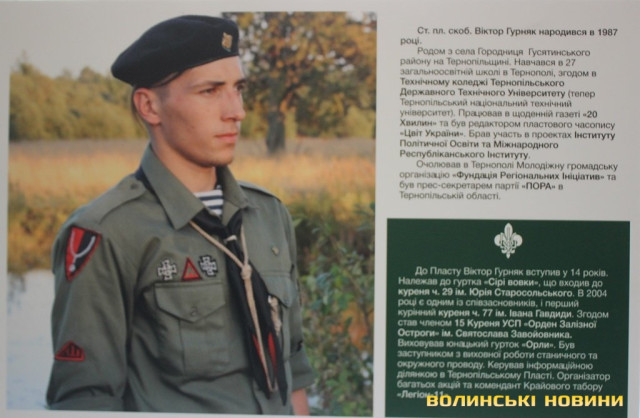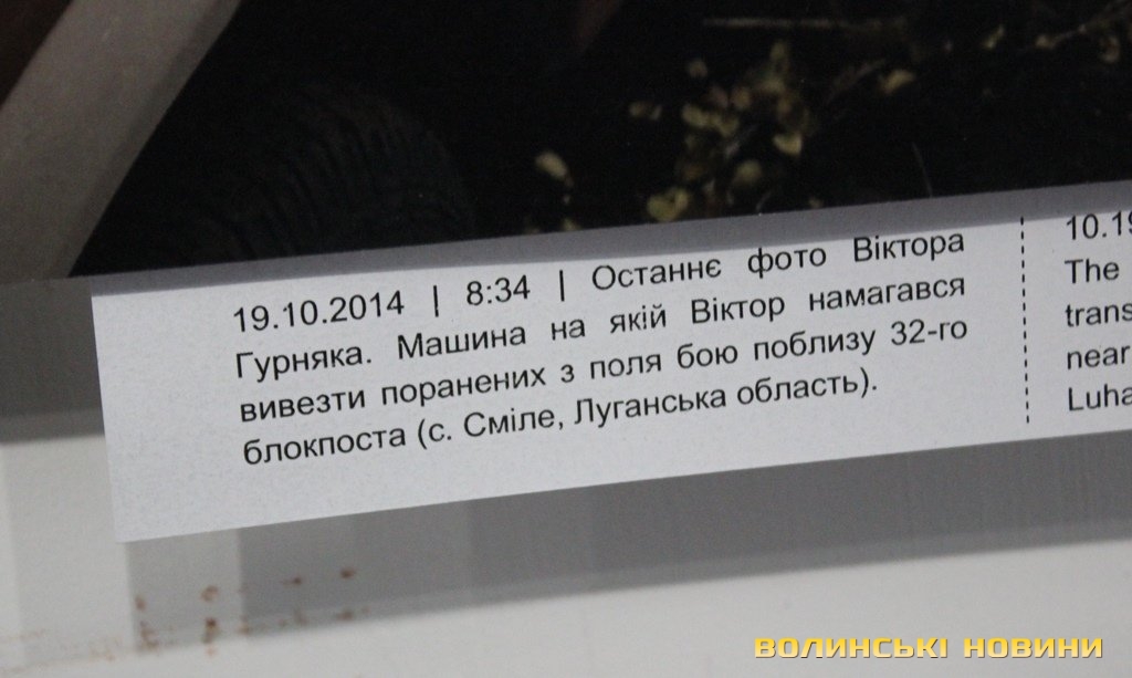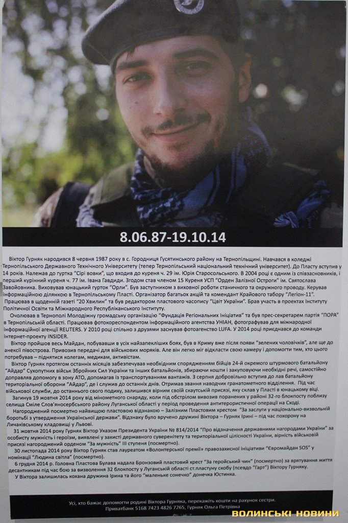 «Віктор Гурняк був пластуном. Ми дізналися, що у Рівному є посмертна виставка його робіт і вирішили показати її лучанам, аби люди знали своїх героїв. Він був Людиною з великої літери, адже ніколи не полишав своїх у біді й завжди був готовий іти на жертви заради Батьківщини. Його світлини розташовані у порядку місць його перебування – спочатку на Майдані, пізніше на війні, коли пішов добровольцем в «Айдар». Це не просто фотографії – це історія життя», – розповів у коментарі для читачів Інформаційного агентства Волинські Новини голова скаутської організації «Пласт» Олег Лапковський.