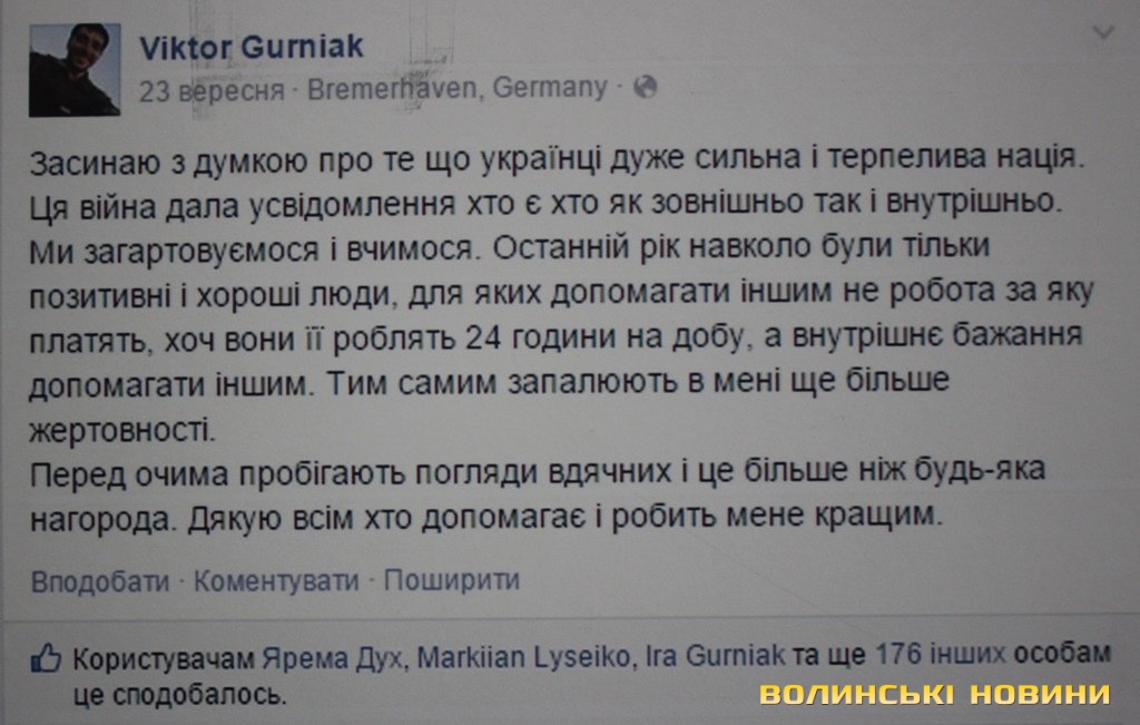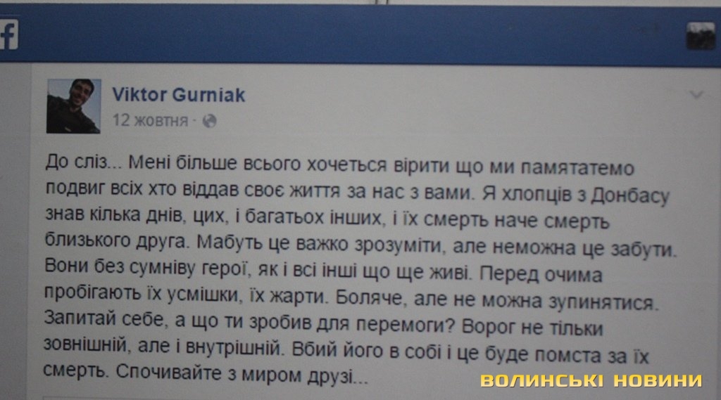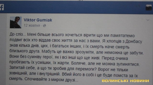 «До сліз... Мені більше всього хочеться вірити, що ми пам’ятатимемо подвиг усіх, хто віддав своє життя за нас з вами. Я хлопців з Донбасу знав кілька днів, цих і багатьох інших, і їх смерть, наче смерть близького друга. Мабуть, це важко зрозуміти, але не можна забути. Вони, без сумніву, герої, як і всі інші, які ще живі. Перед очима пробігають їхні усмішки, жарти. Боляче, але не можна зупинятися. Запитай себе, а що ти зробив для перемоги? Ворог не тільки зовнішній, але і внутрішній. Вбий його в собі, і це буде помста за їхню смерть. Спочивайте з миром, друзі...», – пост від 12 жовтня.