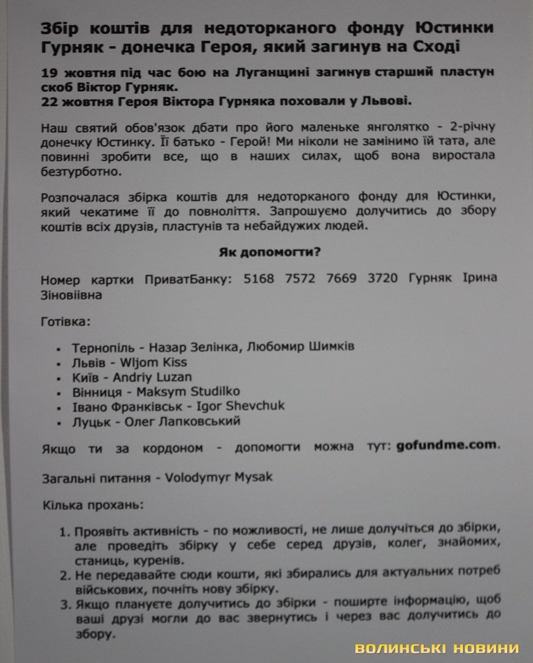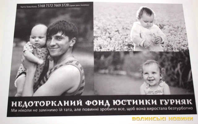 Усі небайдужі можуть допомогти й донечці загиблого героя – переказати їй кошти. Номер картки «ПриватБанку»: 5168 7572 7669 3720 Гурняк Ірина Зіновіївна.Виставка «Від Майдану до війни» діятиме впродовж тижня.