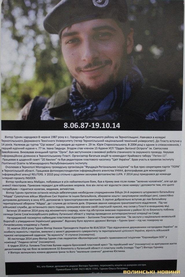 Віктор Гурняк загинув на Луганщині, коли вивозив поранених бійців АТО з місця бою. Його фотовиставка – це життєвий шлях патріота, від подій на Майдані до війни на сході.