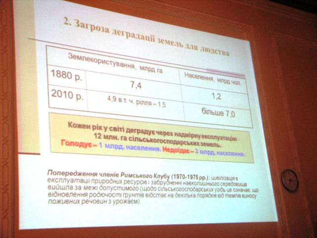 Про архіважливість піднятого питання говорять кілька фактів. Зокрема, за останні 200 років площа земель у користуванні людства зменшилося у п’ять разів. Щорічно у світі деградує в середньому 12 млн. га угідь., тоді як природний темп відновлення родючого шару ґрунту – 1 сантиметр за 100 років. Якщо не призупинити ці тенденції, до середини ХХІ століття продовольства може вистачити лише для двох млрд. людей. Про можливості екологічного і продовольчого колапсу попереджують експерти ФАО ООН, Римського клубу й інших міжнародних інституцій.