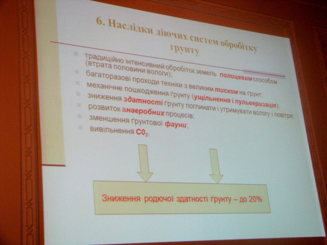 Про організацію раціонального використання та охорони земель на регіональному рівні доповів кандидат економічних наук, директор ТзОВ «Інститут земельних відносин та охорони навколишнього середовища» Анатолій Шворак. За даними обстеження закладу торік в області в середньому на один гектар посівної площі вносилося органіки лише 1,9 тонни – найменше за останні 15 років. 29 господарств, які здійснюють діяльність на більш як 400 га зовсім її не вносять. Відтак назріла пропозиція запровадити раціональні розміри агропідприємств. До речі, більше 5 тис. га використовують сім підприємств, що займає більше 24% площ усіх сільгоспугідь. Є необхідність також запроваджувати заходи з консервації малопродуктивних земель, господарське використання яких економічно неефективне, шляхом заліснення.