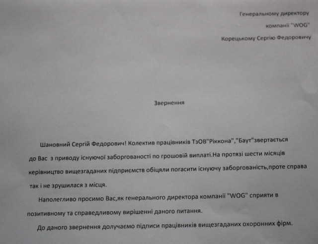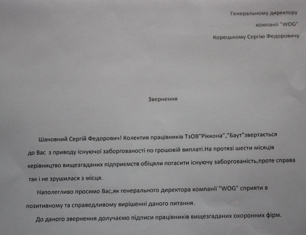 Окрім цього, написали звернення до генерального директора компанії «WOG» Сергія Корецького та повторне звернення до народного депутата Степана Івахіва. У зверненнях йдеться про те, що керівництво фірм «Ріккона» та «Баут» протягом шести місяців обіцяє погасити існуючу заборгованість із виплати заробітної плати, але справа не зрушується з місця.Нагадаємо, раніше працівники фірм вже організовували акцію протесту. Тоді керівництво їм пообіцяло скласти графік погашення боргів.