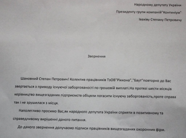 До нардепа Степана Івахіва повторно звертаються працівники охоронної фірми, пов’язаної із групою компаній «Континіум», щодо погашення заборгованості з виплати зарплати.