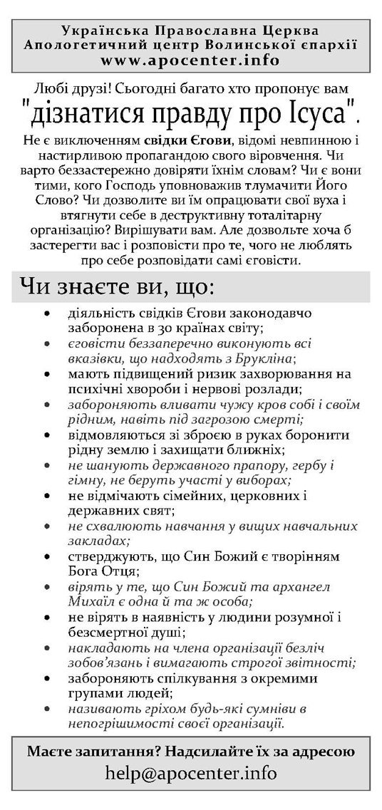 Представники апологетичного центру при Волинській єпархії УПЦ спільно з активістами братства преподобного Миколи Святоші провели захід, який інформував про «потенційну небезпеку, яку створює діяльність секти свідків Єгови».