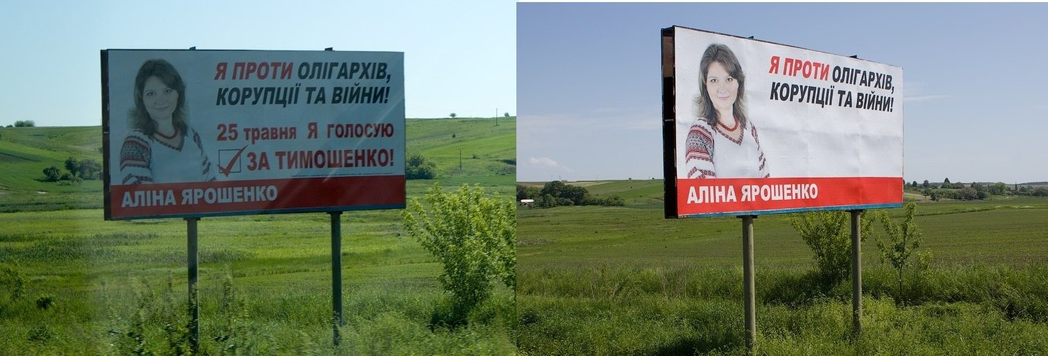 Сьогодні ж ці біг-борди не були зняті, а на них просто було заклеєно окремі фрази, зокрема про підтримку кандидата та відомості про друк. Але це не змінює того факту, що ця реклама виготовлялась за кошти виборчого фонду і є агітаційним матеріалом. Тож таку форму реклами можна вважати агітацією, а отже й порушенням.