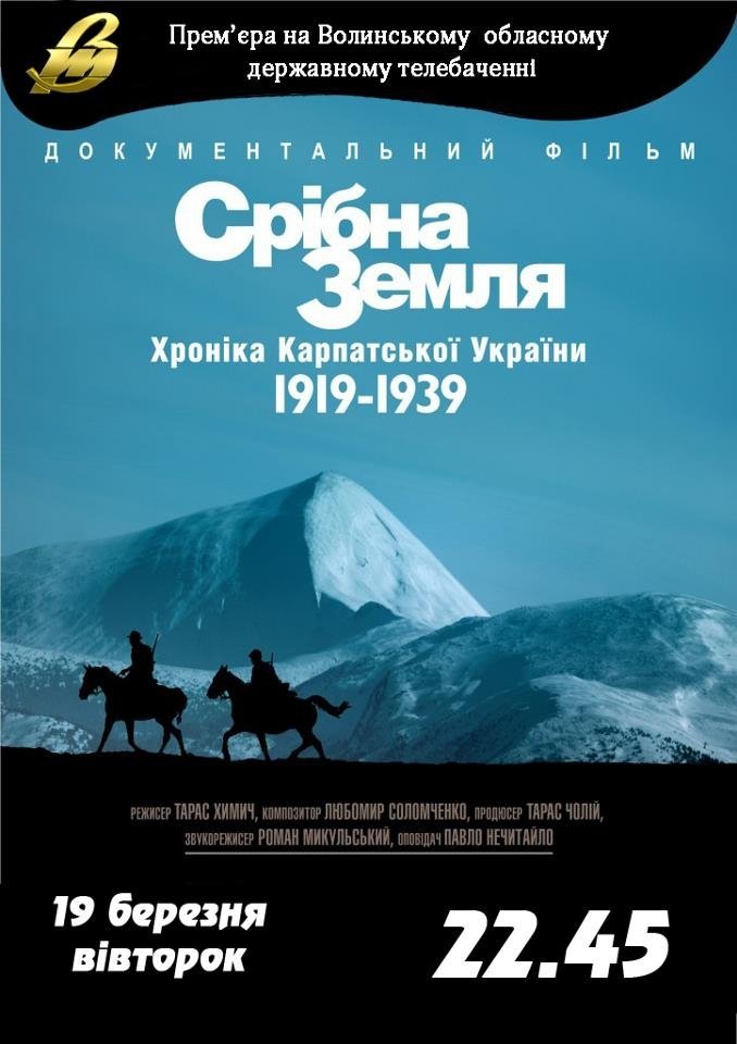 Прем'єра документального фільму «Срібна Земля. Хроніка Карпатської України 1919–1939» відбудеться у вівторок, 19 березня, о 22:45 на Волинському телебаченні.