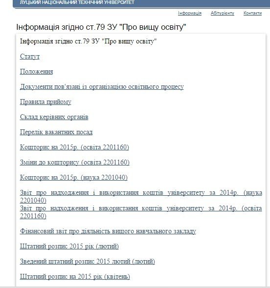 Станом на 16 жовтня 2015 року порушення зафіксували у Луцькому національному технічному університеті та Волинському інституті післядипломної освіти. В обох навчальних закладах на офіційних сайтах були відсутні штатний розпис та статут університету.