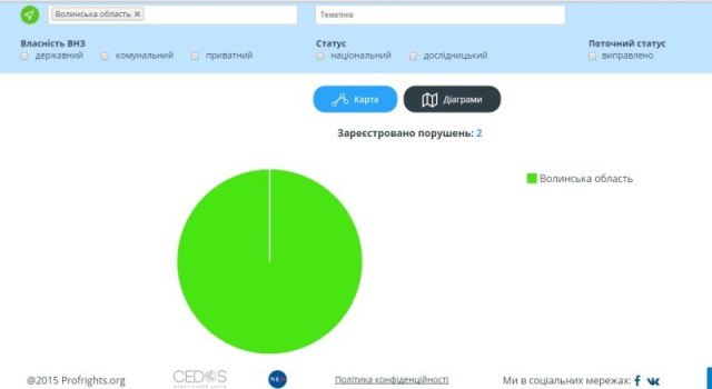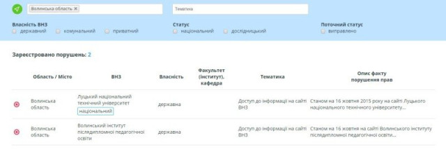 Серед порушень, які зареєстровані на порталі, є й інформація про волинські виші. Повідомлень всього два.